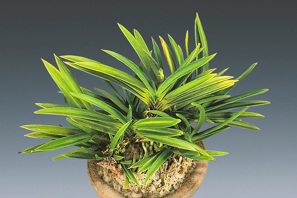 고치현(高知県) 夜須町의 夜須川 하구 인근의 감나무에서 발견되었다는, 독특한 중반(中斑) 품종이다. 무늬는 위에서 보면 단순한 중반이지만, 정면에서 보면 세세한 줄무늬가 모여, 요반(腰斑)과 같은 분위기를 연출하는 특이한 중반이다. 일반적인 중반은 긴 세월이 지나면, 두렷했던 무늬는 점점 무너져 흐릿해지는 경향이 있으나, 이 품종은 많은 시간(30년)이 지났지만, 전혀 변하지 않고 일정한 무늬 패턴을 유지해 안정적이다. 화려하고 임팩트적인 대단한 예(芸)는 아니지만, 지금까지 없던 중반으로 흥미로운 품종이다. 조금 작은 입엽의 모습을 새의 날개에 비유, 또 중반 속의 줄무늬를 음표(音標)의 오선(五線)으로 보고, "음우(音羽)"로 野町敦志 씨의 명명이다. 잎은 다소 좁은 입엽성의 소형 종이다. 청축에 청근으로, 붙음매는 월형이다.