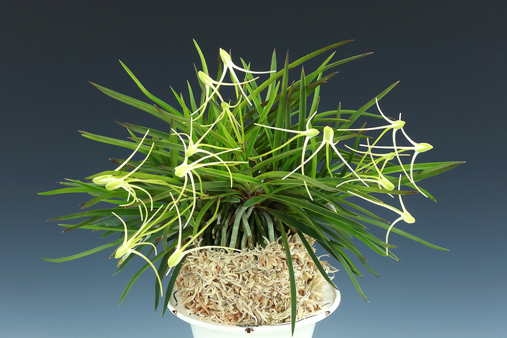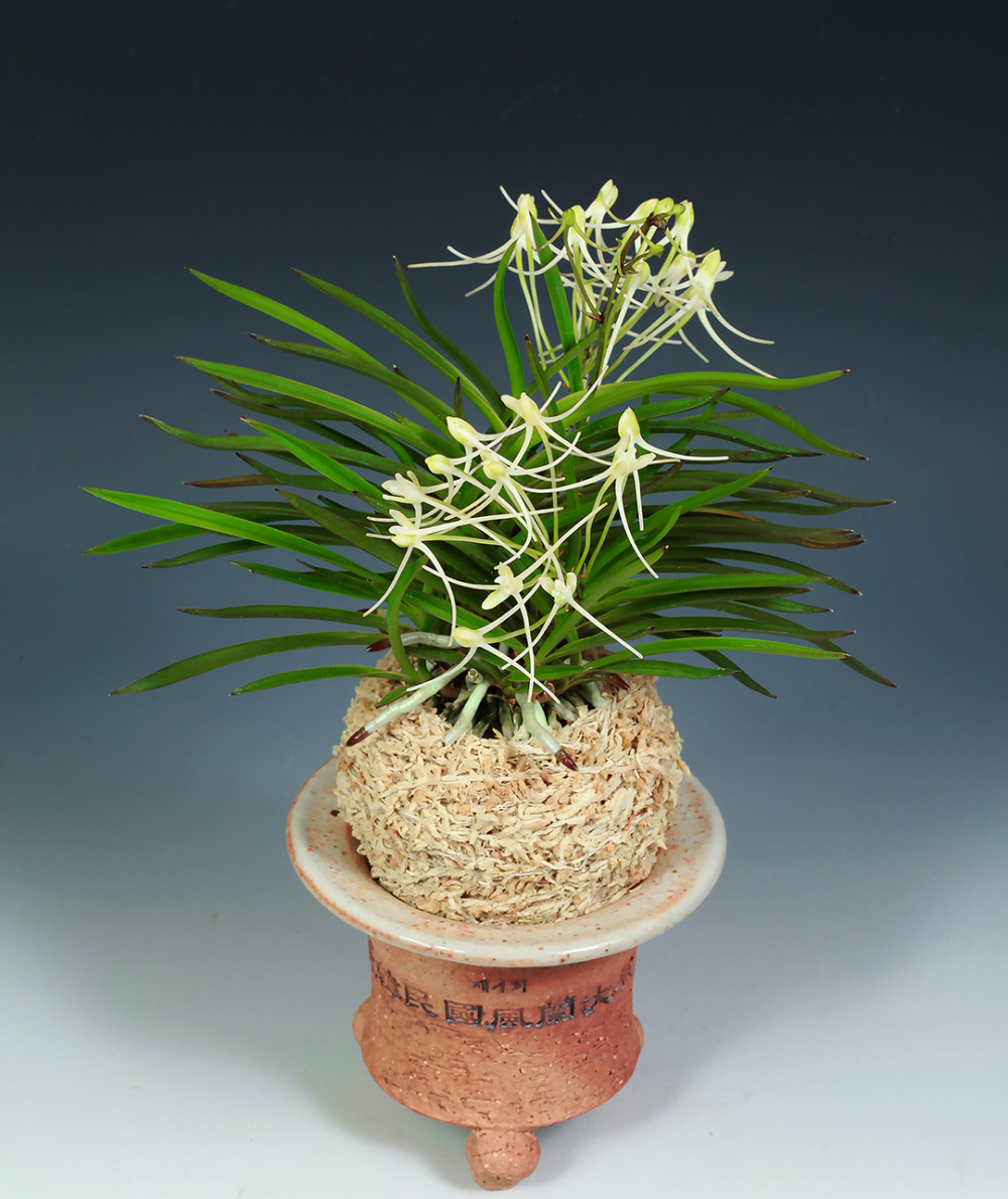 중형에 좁은 잎으로, 삼접피기(三蝶咲:거 3개)라고 불리는 꽃 변이 품종이다. 약 1994년경에 야생종에서 선별되었다. 꽃은 꽃잎이 설화(舌化)된 것이다. 설(舌)이 3장으로, 설에 붙은 거(距)도 3개로 나와, 마치 닻(錨. 갈고랑이)과 같은 꽃 모양이다. 풍란으로서는 첫 삼접피기(三蝶咲, 나비꽃)로 한 개만 있어도 눈에 띄는 거가 세 개씩이나 나와, 요란하고 호화로운 꽃이다. 규슈(九州) 산으로, 아이치현(愛知県)의 伊藤守 씨가 예(芸)의 고정성을 확인하고 부귀란계에 소개했다. 이 요란한 꽃은, 불 끄기의 전(纏)을 연상하여 "화전(花纏)"이라 명명하였다고 한다. 그루(株)의 세력이 약하거나 꽃을 너무 많이 붙이면, 꽃봉오리 상태에서 피지 않고 끝나는 경우가 많지만, 꽃봉오리 상태를 좋아하는 사람도 많다. 피어도 좋고, 피지 않아도 좋은, 정말로 드물고 귀한 꽃이다. 잎은 규슈 산치고는, 가늘어(細葉) 다소 가냘픈 모습이다. 니축에 니근으로, 붙음매는 월형이다.