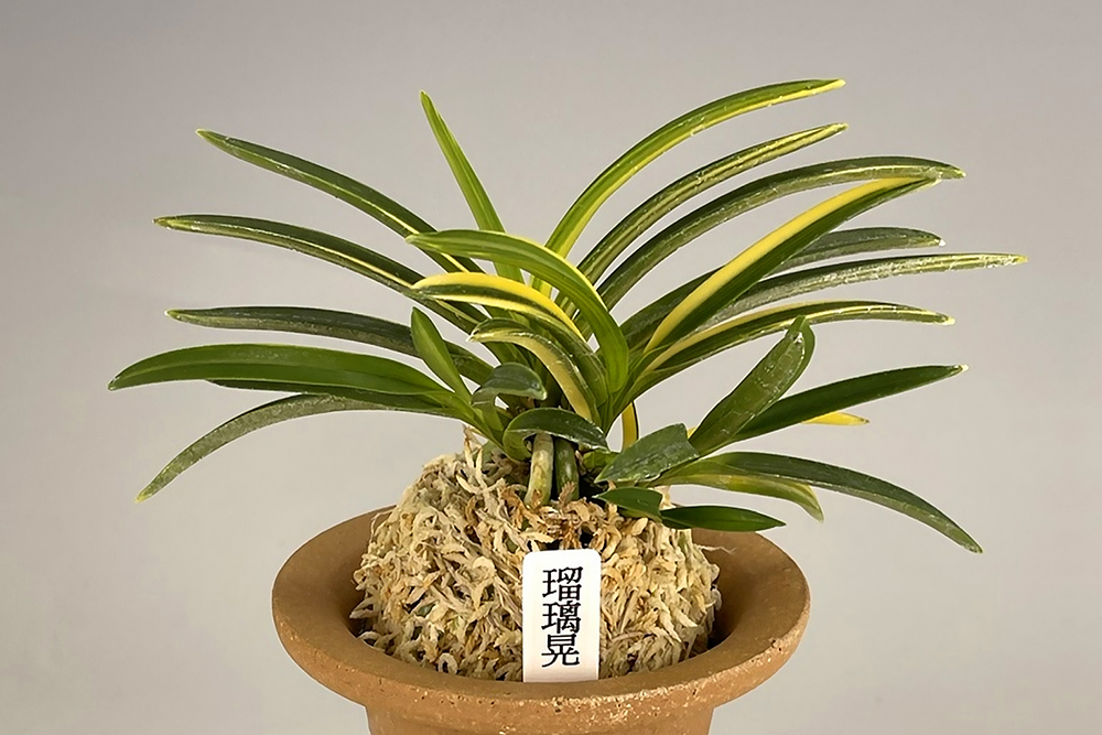 평엽(平葉)에 약간 가까운 희엽으로, 잎 살이 두꺼운 중형 품종이다. 선천성(先天性)의 백황호(白黃縞)가 흐르는, 균형감이 좋은 잎 자태가 특징적이다. 야마구치(山口)현 산으로, 산지 부근에 있는 유리황사(瑠璃晃寺)라는 아름다운 절 이름에서 "유리황(瑠璃晃)"이라는 이름 붙였다 한다. 하지만, 이 품종은 이미 많은 수가 여러 곳으로 분산되었기 때문에, 다른 곳에서 또 다른 이름이 붙여졌을 가능성도 있다. 축은 부위(軸元)가 약간 오염될 정도의 청축으로 느껴지지만 니축이며, 뿌리는 깨끗한 청근이다. 균형 잡힌 잎 형태와 백황 줄무늬의 대비가 좋아, 앞으로 기대할 수 있는 유망주라고 할 수 있다. 잎의 질감도 부드럽고, 보기에도 깔끔한 몸매에, 반 입엽의 자세가 샤프함을 느끼게 한다.