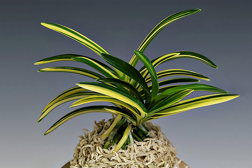 반 입엽으로 잎 포개짐(襟組)이 좋은 모습은, 균형감 있게 품격이 높다. 다소 후천성이지만, 발색은 빠른 편이다. 백황색(白黃色)의 줄무늬(호)를 넓은 잎에 세세하게 흘린다. 호물(縞物)로서는 그다지 난폭하지 않고, 무늬의 계속성도 높다. 산지는 구마모토현(熊本県)이다. 또한, 잎살이 두꺼운 대형의 모습은, 규슈 산(九州産)의 독특함이다. 본종도 애호가의 난실에서 오랫동안 재배되고 있던 것으로, 어느 정도 증식됨에 따라, 그 예(芸)의 안정성과 계승성이 인정되어, 2004년도 일본 부귀란회 신등록되었다. 본종에서 복륜으로 된 것을 '천황관(天晃冠)'이라 한다. 잎은 폭이 넓고 길이가 길며, 결이 고운 비단 같은 감촉이다. 축의 니(泥)는 옅어서 축 부위에 약간의 니가 나올 정도이고, 청근에 가까운 뿌리 끝은 약간 붉은빛이 돌며, 붙음매는 월형이다.
