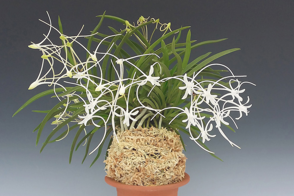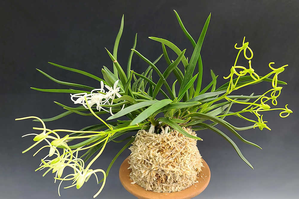 대형의 아마미계 풍란의 「삼접피기(三蝶咲 : 풍란꽃은, 주, 부변(3장)과 내변(2장), 설변에 1개의 거(距)로, 모두 6매로 구성이다. 이 중 주설(主舌)에서 거가 하나, 부변 혹은 내변이 설(舌)로 되어, 거(距)가 모두 3개로 나온다)의 꽃 변이로」 기화(奇花) 품종이다. 원래 아마미 풍란꽃은, 꽃이 크고 꽃줄기가 단단하여 꽃 관상에 적합하다. 이 품종은 거(距)가 3개나 나오는 「화려한 나비피기」 꽃인데도, 꽃대가 휘지 않고 우아하게 피어난다. 보통의 아마미 풍란 실생에서 선별한 것으로, 한 그루(株)만이 돌연변이 한 것이다. 취미가 분이 증식해, "삼각산"으로 명명되었으며, 2010년도 대한민국 풍란 연합회 등록 품이다. 일본으로 반입된 것은 "만주사화(曼珠沙華)"로 붙어졌다. 그 큰 꽃(大輪)에 삼접피기(三蝶咲:거가 3개)라는 진기함에 인기가 매우 높은 꽃이다. 실제로 이 꽃을 보면, 화물(花物) 마니아가 아니더라도 한분(一盆)는 키워보고 싶을 법한 걸작이라고 할 수 있다. 잎은 매우 좁으며, 길이가 긴 대형 품종이다. 니축에 니근으로, 붙음매는 월형이다.
