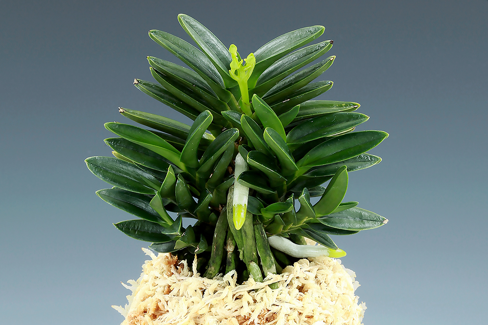 청축, 청근의 두엽 품종이다. 1975년에 4촉의 그루터기로, 가고시마현(鹿兒島縣)에서 발견, 혜성처럼 등장하여 순식간에 두엽의 최고 자리로 올라간 특별한 품종이다. 필자가 실물을 처음 본 것은, 1984년경으로, 東京 백화점에서 전시 즉매회를 열었을 때, 신아가 2촉 붙은 '홍공작(紅孔雀)'이 一千万円, 이 '취선(翠扇)'은 단 1촉에 五百万円의 가격이 붙어 있어, 품종의 희귀성도 그렇지만, 너무나 높은 가격표에도 깜짝 놀랐던 기억이 있다. 1999년도 일본 신등록품이다. 붙음매가 월형인 두엽은 더러 있지만, 다른 품종과는 사뭇 다른 정취를 느끼게 한다. 처음에는 청축 청근에 황화(黃花)가 핀다는 소문에, 실물을 볼 때까지는 사진으로만 보면서, 꿈에서만 상상했다고 한다. 사실은 옅은 크림색 꽃으로, 빨리 노랗게 된 것으로 오해했던 것 같다. 하지만, 실제로 봤을 때는 크림색의 둥근 매변화(梅弁花)로, 실망은커녕 크게 감동을 받았다고 한다. 잎이 두꺼운 입엽성으로, 축은 굵고, 잎 겹침(襟組)이 단정하여 아름답다.