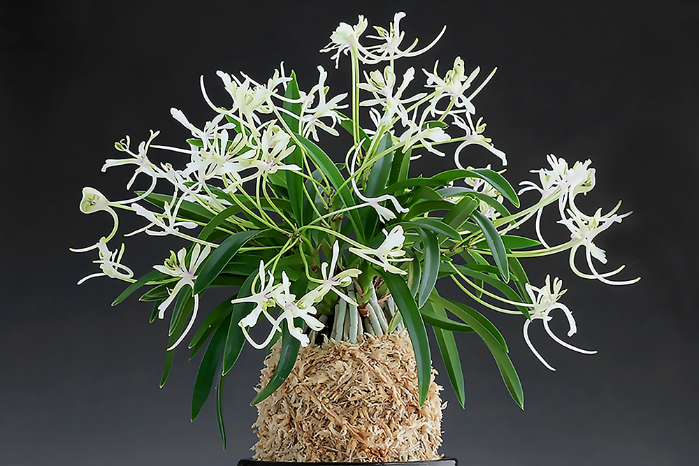 대형 종으로, 만곡엽(湾曲葉)에 가까운 희엽이다. 일반적인 무지 잎(靑)이지만, 이 품종은 꽃 변이 품종으로 명감(銘鑑)에 등록되었다. 규슈(九州)의 미야자키(宮崎) 산으로, 오사카(大阪)의 전문점이 "산취설(山吹雪)"이라고 명명해, 판매한 것이다. 꽃은 단단하게 조여진 겹꽃(八重)피기로, '춘급전(春及殿)'과 '천여지무(天女之舞)'처럼 단피기(段咲 : 위로 올라가며 피는 것)로는 되지 않는다. 꽃 수술대(花芯)를 붉게 물들이는 색다른 겹꽃(八重) 품종이라고 할 수 있다. 2002년도의 명감(銘鑑) 신등록 품종으로, 아직 화분 수도 적고, 인기가 있어, 현재, 화예품으로서는 최고의 평가를 받고 있다. 꽃 애호가에게는 한 화분쯤은 갖고 싶은 일품이다. 잎은 폭이 넓고, 잎 합침(襟合)과 잎 간의 간격(筬)이 다소 느슨하지만, 부드럽게 곡선을 이루는 희엽이다. 니축에 니근이지만 얼룩은 적으며, 붙음매는 월형이다.