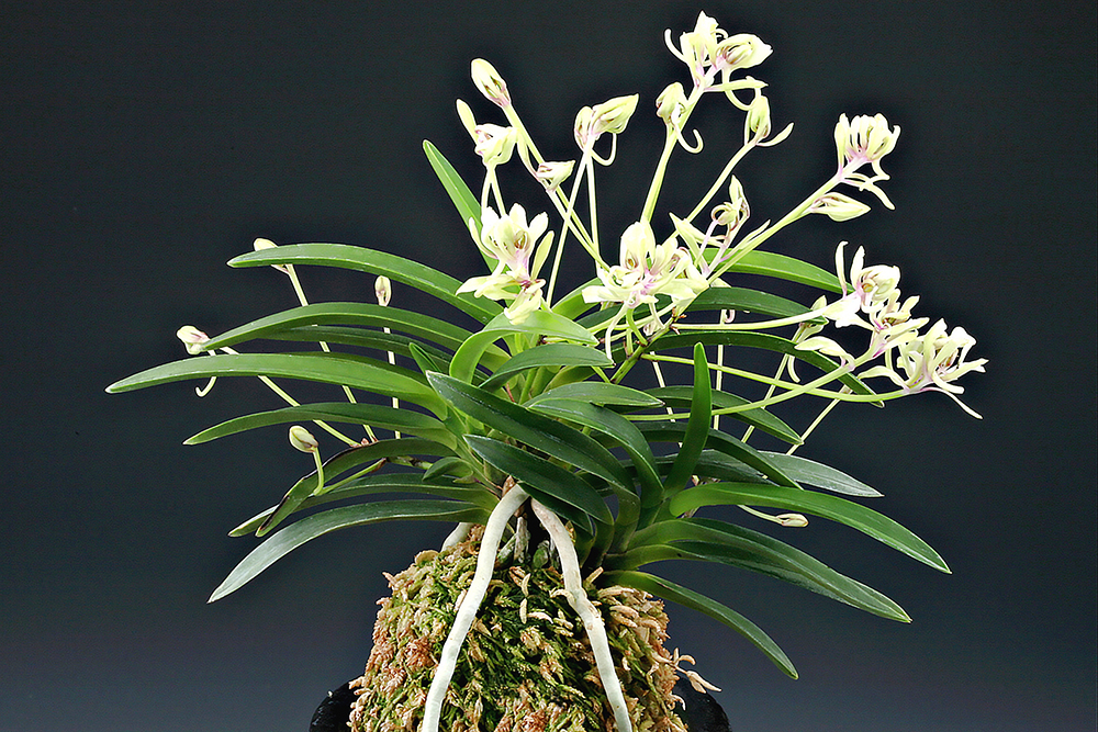 잎이 두껍고, 다부진 희엽으로, 화예품(花芸品) 중에서는, 꽃뿐만 아니라 잎 자태에도 매력이 있는 편이다. 1980년경 규슈(九州)에서 발견된 것으로, '춘급전(春及殿)'에 이어 두 번째로 발견된 겹꽃(八重咲 : 겹꽃 모양으로 피는 기화(奇花) 품종이다. 그 '춘급전'과 비교해 단피기(段咲 : 위로 올라가며 피는 것)는 약하지만, 꽃잎 안쪽에 붉은색이 짙어, 꽃만 봐도 차이를 알 수 있다. '춘급전'은 1931년에 고치현(高知県)에서 발견되었지만, 그 명명자는 「쉽게 다시 나타날 수 없는 드문 명화(銘花)이다」라고 원예지(園芸誌)에 기재되어 있다. 그런데 현재는, 이 '천여지무( 天女之舞)'와 시코쿠(四国)에서 발견된 '남국지무(南国之舞)' 2종이 증가해, 부귀란계에서는 세 타입의 겹꽃(八重咲)을 즐길 수 있다. 2004년도 일본 부귀란회 등록 신품종이다. 니축에 니근으로, 붙음매는 월형이다.