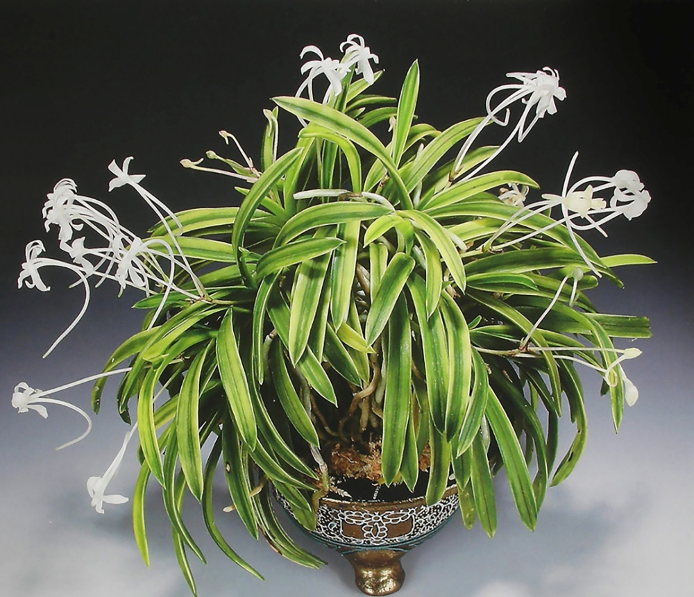 '부악(富嶽)'은 약 1970년경에 등장해 일약 인기 품종이 되었다. 이 품종은 히로시마(広島)의 高木農園이, 고시키 섬(古志岐島) 산의 자연 채취품으로, 약간의 산반(散斑)이 들어간 것을 실생 작출한 것이 출발점이다. 그 자식, 손자, 증손자들이 각지에서 반복적으로 실생하여 거대한 그룹이 형성되었다. 첫 실생은 플라스크에서 밖으로 나와 기르면, 청엽(무지)에서도 산반이 나타났다. 실생 형제이므로 다양한 잎 모양이 있으며, 현재는 '부악'을 부모로 명품이 교배되어 잎 형태의 다양성은 더욱 늘어나고 있다. 청엽에서 우연히 출현한 산반이지만, 무늬의 유전성은 매우 강하다. 다양한 잎 모양 중 특히 특징이 두드러진 것으로, 또 다른 개체명이 붙어 있다. 크고 두꺼운 '대납언(大納言)', 무늬가 하얗게 변하는 '부악보(富嶽宝)', 그리고 황산반(黃散斑)에 청축인 '청축부악(靑軸富嶽)' 등으로, 「부악 계통」만으로도 명감을 제작할 정도로 여러 품종이 있다. 니축에 니근으로, 붙음매는 월형이다.