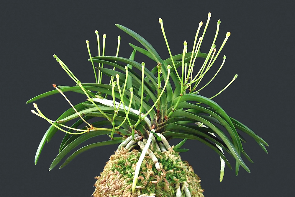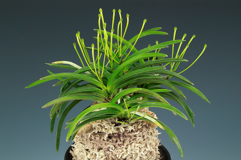 규슈(九州) 산으로 중형의 보통 풍란이다. 꽃 변이 품종이지만, 사진에서 보이는 것처럼 작은 녹색 탁구공 같은 상태로 끝난다. 처음, 이 꽃을 봤을 때는, 혹시 거(距)가 없는 육변화(六弁花) '성차(星車)' 타입의 봉오리일 거라고 생각했다. 그 '성차'는 이 상태에서 점점 풍선처럼 부풀면서 꽃을 피운다. 그러나 이 품종은, 봉오리 상태 그대로 시간이 멈춘 듯 시들기를 기다린다. 이 얼마나 덧없는 꽃인가. 이것을 꽃이라고 불러도 되는 것일까. 뭐라고 말할 수 없는 기이한 느낌에 우스꽝스럽게 보이기도 하지만, 의외로 인기가 많다. 야생종 중에서 선별, 아이치현(愛知県)의 이토(伊藤守) 씨가 「아무도 얼굴을 본 적이 없다는 의미로」 명명이다. 2015년도 명감 신등록 품이다. 일반적인 잎으로, 니축에 니근이며, 붙음매는 월형이다.