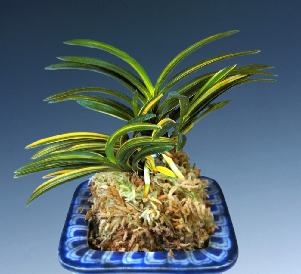 약간 입엽성의 웅장한, 백호(白縞) 품종이다. 본래 「고천수의 백호(高千穂白縞)」라고 불리며 유통되었던 품종이다. 「고천수의 백호(高千穂白縞)」(미등록)에는 황호(黄縞)와 백호(白縞)가 유통되고 있으며, 특징이 뚜렷한 그 백호는 2002년도에 '용천금'으로 본종이 신 등록되었으며, 황호 쪽은 '보금(宝錦)'과 혼재되어 유통되다가, 2005년도에 '천령(天領)'으로 명감에 신 등록되었다. 미야자키현(宮崎県) 霧島에서 나온 것이다. 축원(軸元)에서는 입엽성이지만, 잎 중간부터 완만하게 휘어지는 희엽으로, 볼륨감에 있어서는 '천령'에 한 발 뒤지지만, 웅대하다. 무늬는 거의 선천성에 가까운 백황색호(白黄縞縞)로, 아래 잎일수록 흰색(白)에 가까운 백황호가 된다. 예(芸)의 깊이 면에서는, 「고천수 삼 형제(高千穂 三兄弟)」 중에서도 특출하다. 축은 니축이지만, 붉은빛이 강하고, 뿌리는 니근으로, 붙음매는 월형이다.