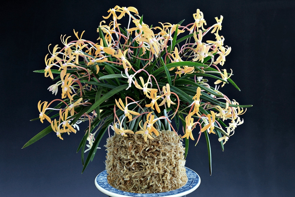 일본 아이치현(愛知県)에서, 실생 작출된 황화(黃花) 품종이다. 양란과 풍란을 교배한, 극황색 꽃을 피우는 품종이 있는데, 그 교배종에 다시 한번 풍란의 붉은 꽃(赤花)을 더한 것이라고 한다. 진노란 꽃잎 끝과 뒤에 붉은빛을 띤, 주금색(朱金色)이다. 또한 꽃의 씨방(子房)과 거(距)도 붉은 보라색(赤紫色)을 띄워, 복색화(複色花)로서 인기가 높다. 풍란 원종의 황화는 '서운(瑞雲)'의 황색(크림색)이 제일 진하며, 극황색으로 피는 꽃은 반드시 양란 피가 들어 있다고 생각하면 틀림없을 것이다. 최근에는 몇 번의 교배를 걸쳐, 잎 모양이나 꽃 모양만으로는 양란 피가 들어 있는지 분간할 수 없을 정도가 되었다. 하지만, 당연히 양란 피가 섞여 있기 때문에 부귀란이 될 수는 없지만, 꽃이 피는 계절에는 이런 이색적인 색화(色花)를 즐기는 것도 하나의 재미다.