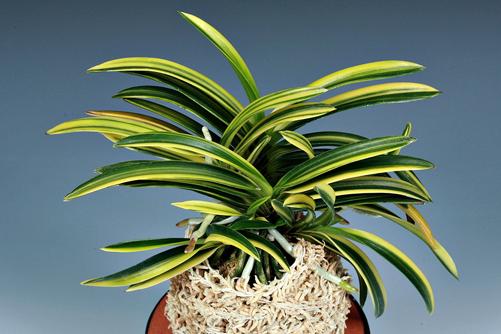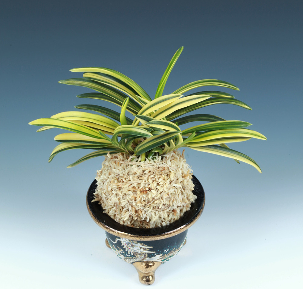 잎은 두껍고 잎끝까지 힘이 있어, 당당하고 힘차게 느껴지는 잎 모습이다. 비단결처럼 곱고, 매끄러운 견지합(絹地合)에, 감성(紺性)도 강한, 광택 잎이다. 무늬는 약간 후천성으로, 새잎이 나올 때는 어린 풀빛의 연두색(萌黃色)으로 오른 후에 황색(黃)으로 밝아진다. 오래된 잎(古葉)의 무늬는 황색이라기보다 백황색(白黃色), 즉 즉 흰색에 가까워진다. 흔히 '금두(金兜)'와 혼동되지만, 잎 모양이나 무늬 색상 등, 양쪽의 본예품(本芸品)을 나란히 놓고 비교하면 한눈에 확연히 구분할 수 있다. 그러나 재배 환경과 장소, 키우는 방법에 따른 차이, 또 본래의 특성(本芸)이 잘 드러나지 않는 어린 그루(小株)에서는 구분하기 어려운 경우가 많은 것도 사실이다. 본 종이 중투 예(中透芸)로 변한 것은 '보중반(宝中斑)'이며, 복륜으로 변하면 '보복륜(宝覆輪)'이라고 한다. 니축에 니근으로, 붙음매는 월형이다.