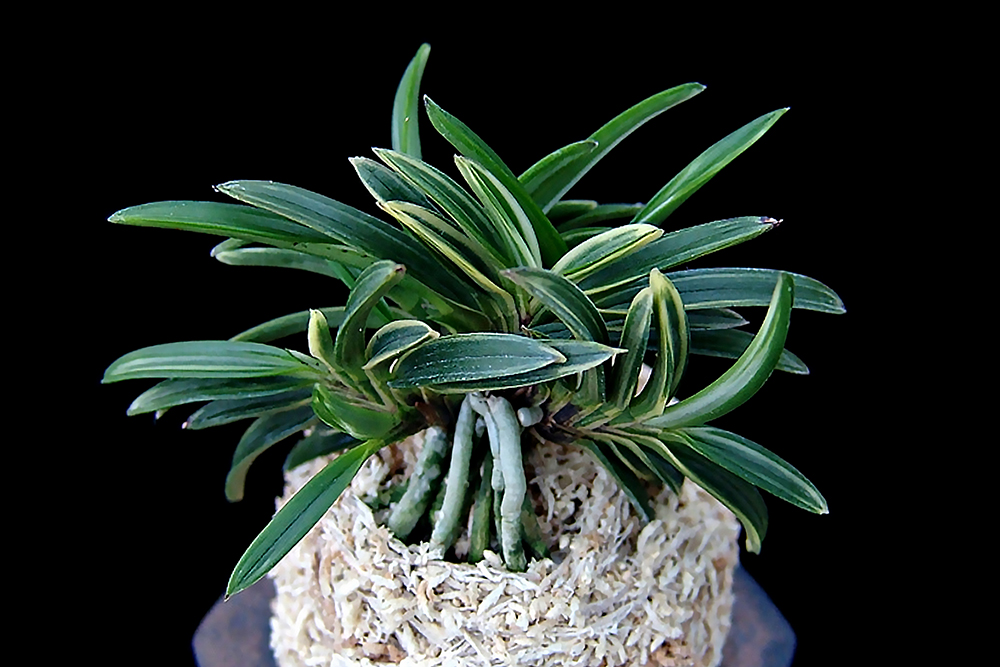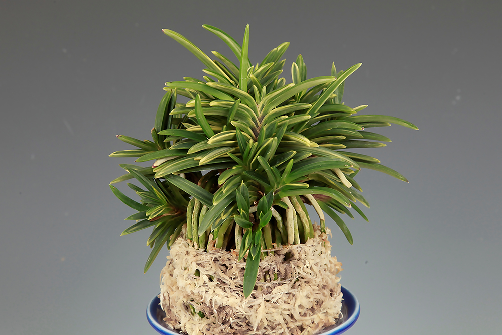 다양한 변화 종의 모종으로 유명한 '서출도(西出都)'로부터, 이 품종도 출현했다. 모종에서, 비교적 나오기 쉬운 품종으로는 '진학(真鶴)'이 있다. 또한, 돌연변이적으로 나온 품종에는 '옥금(玉錦)'과 이 '준(隼)'도 역시 '서출도'로부터 출현한 변이로 생각된다. 이 돌연변이로 출현한 '준(隼)'과 '옥금' 등은 모종을 오랫동안 재배해도 '진학'처럼 쉽게는 출현하지 않는다. 소형이며, 입엽이지만 잎 간격(筬詰)이 조밀하고, 잎 유지가 좋다. 특이한 잎 모습으로 인기가 많다. 예(芸)의 안정성은 좋지만, 가끔 모종으로 돌아가는 子가 태어나기도 한다. 잎 여밈(襟合)이 좋은 입엽성이다. 잎끝이 '은세계(銀世界)'처럼 둥글게 끝나지 않고, 끝이 뾰족하다. 절입복륜(切込覆輪)으로, 니축에 니근이며, 붙음매는 파형의 일자형이다.