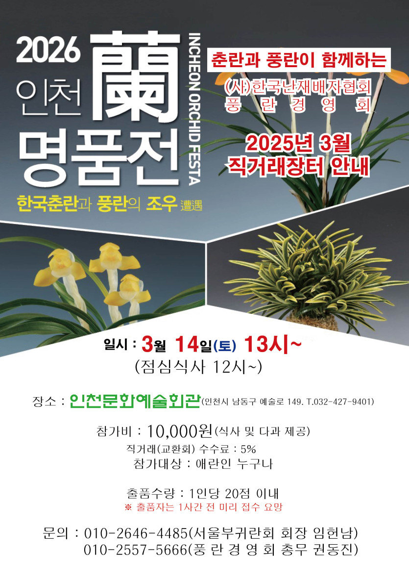 2026년 3월 풍란경영회 직거래장터안내입니다 페이지 정보 처음처럼 작성일26-03-09 17:21 조회13회 댓글0건 관련링크 본문 2026년 3월 풍란경영회 직거래장터안내입니다1. 일시 : 2026년 3월14일(토) 13:00 ~2. 장소 : 인천문화예술회관(인천시 남동구 예술로 149)3. 참가비 : 10,000원4. 1인당 20점이내 출품가능하오니 많은 참석부탁드립니다 댓글목록 등록된 댓글이 없습니다. 다음글 목록