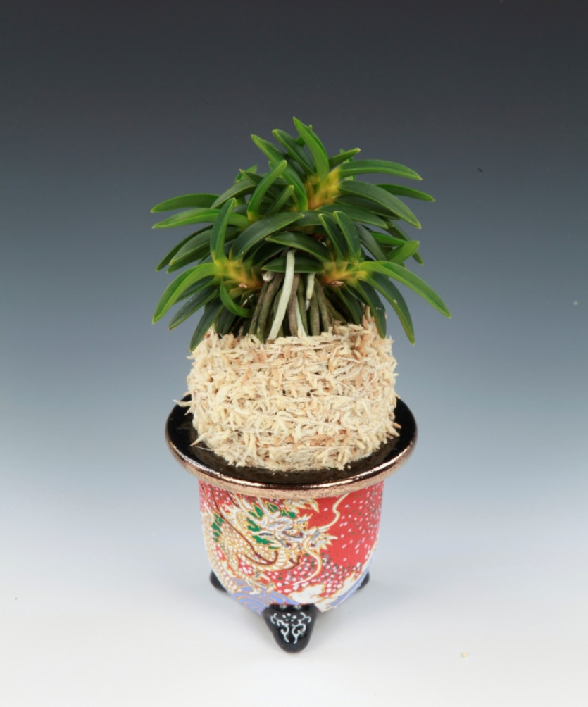 품종의 특징 : 실생의 병속에서도 요반(腰斑)의 특징을 보여주는 개체로 선별되어 키우는 과정에서도 어느개체보다 확실한 요반(腰斑)을 보여주고 엽예(葉藝)또한 가지런한 두엽의 모습을 가지고 있다. 또한 종종 흐르는 청묵(靑墨)이 또다른 변화의 시작점일지 궁금한 개체이기도 하다. 풍란계에는 확실히 보여지는 요반(腰斑)의 형태는 많지 않은데 두엽의 요반으로 좋은 모습을 보여주고 있어 앞으로가 더욱 기대가 된다. 니축(泥軸)에 니근(泥根)