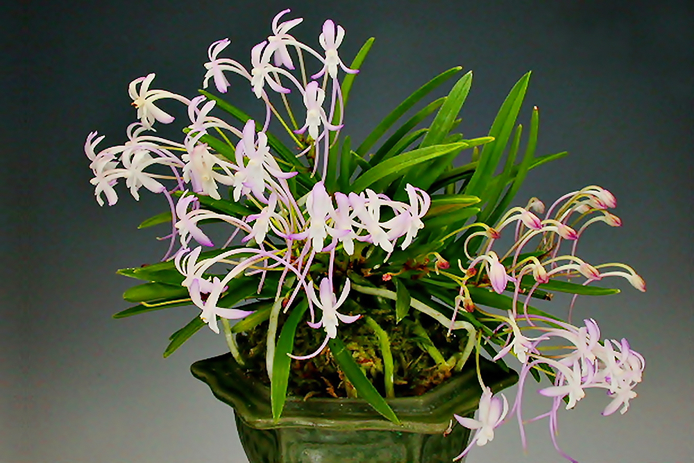도화(桃花)로, 약간 대형이다. 1980년경 실생에서 도화(桃花)로 나온 '도희(桃姬)'의 형제 중에서 선별된, 도화(桃花) 품종이다. '도희'는 소형 품종이지만, 이 품종은 중대형으로, 잎이 두껍고 폭도 넓은 대형 종이다. 꽃은 검붉은 화경(花莖)에, 꽃잎과 거(距)를 짙게 물들여, 전체적으로 보라색의 색조가 강한 대륜의 도화다. 이 품종 그루의 자태, 꽃도 커서, 배수체(倍數體:염색체의 수가, 같은 種의 통상적인 기본 염색체 수의 갑절로 되어 있는 개체) 때문이 아닐까 하고 말들 한다. 때로는 줄무늬(縞)가 나오기도 하는데, 백황호(白黃縞)로 '자직(紫織)'이라고 한다. 잎은 입엽성 희엽으로, 우람한 대형 종이다. 니축에 니근으로, 붙음매는 월형이다.