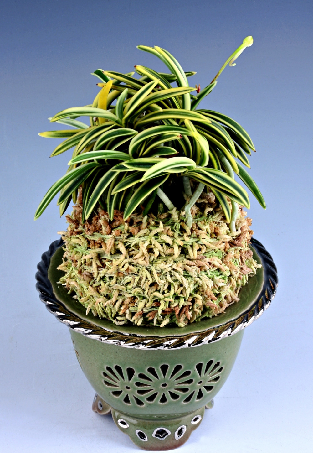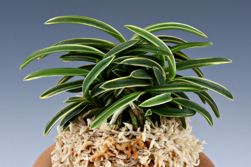 '서출도(西出都)'에서 변화 품종으로, 무늬 성질은 같지만, 잎 모양은 입엽성인 모종에 비해 이 '옥금'은 만곡엽(湾曲葉)에 가까운 희엽으로 되었고, 크기도 소형이 되었다. 약 1980년경, '서출도'를 많이 재배했던 하마마츠(浜松)의 난실에서 1촉의 싹(芽)이 돌연변이로 나온 것이다. 소형이면서 만곡엽으로 변한 모습이, 구슬(玉)처럼 너무나 귀엽고 동글동글해서 "옥금(玉錦 )"이라고 명명한 것이라고 한다. 희엽의 소형은 자태만으로도 사랑스러운데, 백복륜을 두른 모습은 참으로 아름답고 매력이 가득하다. 화려한 자손을 많이 생겨, 「진학 예(真鶴芸)」가 되기 쉬우며, 복륜만으로 가지런한 그루(株)는 드물다. 본종에서 「진학 예」가되면, 그 이름은 '옥학(玉鶴)'이라 한다. 만곡엽에 가까운 희엽으로, 잎 겹침(葉重)이 좋고 금합(襟合)도 아름답다. 모종과 마찬가지로 선천성의 절입(切込) 백복륜(白覆輪)이다. 니축에 니근으로, 붙음매는 파형의 일자형이다.
