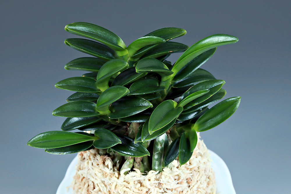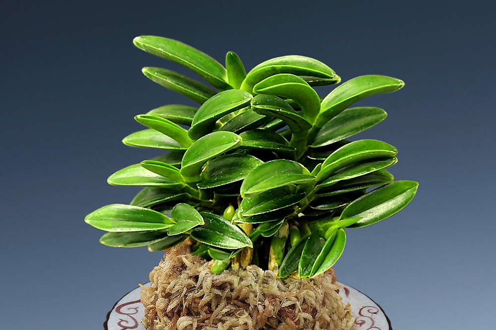매우 작은 두엽으로, 소형이지만 잎살이 두꺼운 볼륨감에, 마치 '흑진주(黒真珠)'를 청축으로 한 것 같은 느낌이다. 초소형 품종에 비해 꽃 붙이기가 좋고, 꽃은 하늘피기(天咲)의 매화꽃(梅弁花)이다. 2000년도 등록으로, 규슈산(九州産)이다. 그루(株)에 비해 꽃이 크고, 관상 가치가 높아, 이쪽 팬들에게 인기가 높은 품종이다. 꽃에 붉은 색소가 있으므로 축(軸)에도 붉은색이 있을 가능성이 있지만, 겉보기에는 완전한 청축과 청근이다. 풍란 두엽은 일반적인 니축에 비하면, 청축 쪽이 압도적으로 적어서, 청축이라는 것도 하나의 예(芸)에 더해질 것이다, 현재는 증식품도 늘고(무지 잎 변이 품이므로, 예(芸)가 안정적이고, 강건하여 잘 늘어난다) 가격도 쉽게 구할 수 있게 되어, 취미가들에게 기쁜 일이다. 잎 길이가 짧고 단단하여, 힘이 넘치는 단정한 잎 모습이다. 청축에 청근으로, 붙음매는 일자형이다.