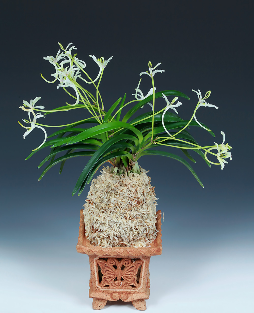 대형 종으로, 만곡엽(湾曲葉)에 가까운 희엽이다. 일반적인 무지 잎(靑)이지만, 이 품종은 꽃 변이 품종으로 명감(銘鑑)에 등록되었다. 규슈(九州)의 미야자키(宮崎) 산으로, 오사카(大阪)의 전문점이 "산취설(山吹雪)"이라고 명명해, 판매한 것이다. 꽃은 단단하게 조여진 겹꽃(八重)피기로, '춘급전(春及殿)'과 '천여지무(天女之舞)'처럼 단피기(段咲 : 위로 올라가며 피는 것)로는 되지 않는다. 꽃 수술대(花芯)를 붉게 물들이는 색다른 겹꽃(八重) 품종이라고 할 수 있다. 2002년도의 명감(銘鑑) 신등록 품종으로, 아직 화분 수도 적고, 인기가 있어, 현재, 화예품으로서는 최고의 평가를 받고 있다. 꽃 애호가에게는 한 화분쯤은 갖고 싶은 일품이다. 잎은 폭이 넓고, 잎 합침(襟合)과 잎 간의 간격(筬)이 다소 느슨하지만, 부드럽게 곡선을 이루는 희엽이다. 니축에 니근이지만 얼룩은 적으며, 붙음매는 월형이다.