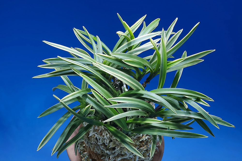 입이지만, 잎끝이 수엽(受葉 : 이슬을 받는 것 같은 느낌의 잎 모양)으로 된 대형 종이다. 비슷한 유사품을 볼 수 없는, 웅장한 모습이다. 감복륜(紺覆輪)의 '국광전(國光殿)'이, 가가와현(香川県)의 난실(蘭室)에서, 황색(黃色)의 조복륜(爪覆輪 : 잎끝에 나타나는 손톱 모양의 복륜)으로 변화한 것이다. 잎끝이 뾰족한 큰 잎(大葉)으로 선천성의 황조복륜(黄爪覆輪)이 들어간다. 이 노란색(黃色)은 재배에 따라 초가을에는 오렌지색으로 선명해져 아름답다. 대부분 조복륜이지만, 드물게 대복륜 모양의 화려한 잎도 나온다. 이 대복륜이 고정된다면 최고로 아름다운 품종이 될 것이다. 1930년대에는 '비(羆)'와 함께 인기가 양분될 정도로 희귀 품종이었으나, 현재는 초급 품종이 되었습니다. 꽃도 봉오리는 진한 노란색(黃)이고, 피면 백황색(白黄色)의 이예품(二芸品)이다. 짙은 니축에 니근으로, 붙음매는 월형이다.
