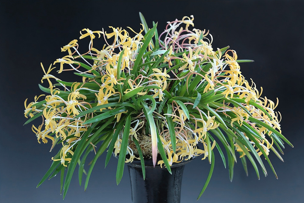 일본 아이치현(愛知県)에서, 실생 작출된 황화(黃花) 품종이다. 양란과 풍란을 교배한, 극황색 꽃을 피우는 품종이 있는데, 그 교배종에 다시 한번 풍란의 붉은 꽃(赤花)을 더한 것이라고 한다. 진노란 꽃잎 끝과 뒤에 붉은빛을 띤, 주금색(朱金色)이다. 또한 꽃의 씨방(子房)과 거(距)도 붉은 보라색(赤紫色)을 띄워, 복색화(複色花)로서 인기가 높다. 풍란 원종의 황화는 '서운(瑞雲)'의 황색(크림색)이 제일 진하며, 극황색으로 피는 꽃은 반드시 양란 피가 들어 있다고 생각하면 틀림없을 것이다. 최근에는 몇 번의 교배를 걸쳐, 잎 모양이나 꽃 모양만으로는 양란 피가 들어 있는지 분간할 수 없을 정도가 되었다. 하지만, 당연히 양란 피가 섞여 있기 때문에 부귀란이 될 수는 없지만, 꽃이 피는 계절에는 이런 이색적인 색화(色花)를 즐기는 것도 하나의 재미다.