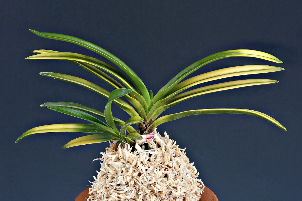 잎 길이가 폭에 비해 상당히 긴. 희엽의 대형 종이다. 1980년대 규슈(九州) 산채 선별로, 「天王植木」에서 소중히 재배되었던, 특수 예(特殊芸)로, 縞와 복륜에 호반(虎斑)의 다예품(多芸品)이다. 예(芸)의 무늬는, 대부분 천엽(天葉)이 푸르게(무지) 나와. 호반(虎斑) 예를 보이다가 후천성의 황복륜(黃覆輪)과 백황호(白黃縞)를 두른다. 특히 이 품종은 무늬 색조가 이채로운데, 복륜 개체는 그로 인해 무늬 색상이 일정하지만, 호(줄무늬)의 경우는 무늬 색상이 흰색(白)이 강하거나 노란색(黃)이 강하게 나타나는 등, 한 그루(株) 속에서도 복잡한 색조를 보여준다. 처음 이 품종에 붙여진 이름은 '몽전(夢殿)'이지만, 동명이종(同名異種)이 존재했으므로, 노마치(野町敦志) 씨가 "관월지연"으로 개명했다. 또한 이 품종은 같은 품종인데, 다른 이름으로, '황유전(黃幽殿)'이란 이름도 가지고 있다. 니축에 루비근도 섞는 니근으로, 붙음매는 월형이다.