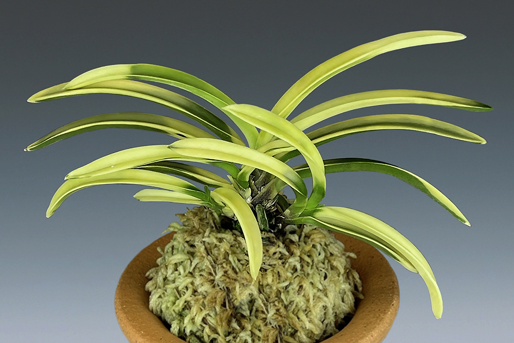 어느 농가 마당의 비자나무 위에서 1993년에 채취했다는 [금직(錦織)]의 유령엽(幽靈葉)으로, [신월전(新月殿)] 타입의 '전반호 예(全斑虎芸)' 품종이다. [금직]은 다양한 무늬를 나타내는 우수한 품종으로서, 싹(芽) 변화에 의해 유령엽으로 된 전반(全斑)이다. 서반(曙斑)과 함께, 잎끝에 녹조(綠爪)를 살짝 올려, 구름처럼 떠 있는 파란 하늘은 황홀하고 낭만적인 전경이다. 유령이라는 말은 자라지 않아 혼자 살아갈 수 없는 개체에 사용하지만, 생육하며 살아갈 수 있는, 본종과 같은 부귀란에 대해서는 '전반(全斑)'이라고 부른다. 따라서 본종은 '虎斑'으로 분류, '금직의 全斑虎', '艶姿'로 명명되었다. 짙은 니축에 총 루비근으로, 역엽(力葉)이 섞이는 대형 품종이다.