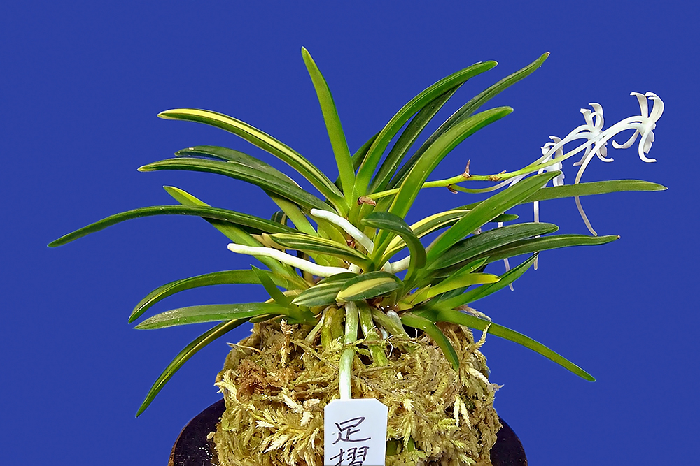 고치현(高知縣) 土佐清水市 足摺岬 산으로, 백황(白黃)의 줄무늬(縞) 품종이다. 이 품종은 처음 채취 당시는 볼품없는 흐릿한 줄무늬였으나, 그 후 몇 년이 지나, 놀랍게도 흰색과 노란색 줄무늬(白・黃色 縞)가 선명하게 들어가 안정된 것이다. 그리고 野村風蘭硏究室에서, 채취한 곳과 연관하여 "족접금(足摺錦)"으로 명명하고, 2014년에 연구실 홈페이지와 土佐竹蘭保存会 전시회 출품 수상작이다. 그 무늬는 그렇게 화려하지도 않은 수수한 예(芸)로, 선천성의 백, 황(白・黃)의 縞를 나타낸다. 잎은 약간 입엽성 희엽의 중형 종이며, 옅은 니축에 니근으로, 붙음매는 월형이다.