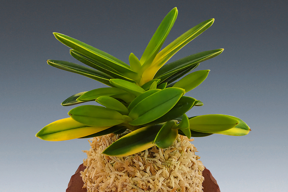 이 품종의 내력은 알려진 게 없으나, 무엇의 실생으로 태어난, 두엽의 호반(虎斑) 품종이다. 아담한 소형 종의 두엽으로, 천엽은 감중통(紺中通)이 살짝 묻어난 서반(曙斑)으로 오르며, 선명한 요반(腰斑)도 나타내는 복잡한 예(芸)를 가진, 호반이 기본인 아름다운 두엽이다. 비고정성(非固定性)으로 진행되는 특이한 무늬는, 서반 위를 짙은 감을 떠올려, 연한 황색의 축입(蹴込)과 가는 실복륜에 감 중반 모양과 독특한 호반을 다시 남기는 전복 예(転覆芸)와 유달리 밝은 무늬는 일반 호반과 차별화가 유별나다. 제18회 대한민국 풍란대전(2024. 부산) 특별상, 제10회 청주풍란대전 다인상(출품 이관호) 수상 품이다.가지런하게 곧게 뻗은 두엽이 앙증맞다. 니축에 니근으로, 붙음매는 파형이다.cbf56c72c60e6766ad738e25e27a77b1_1746482507_1235.jpg