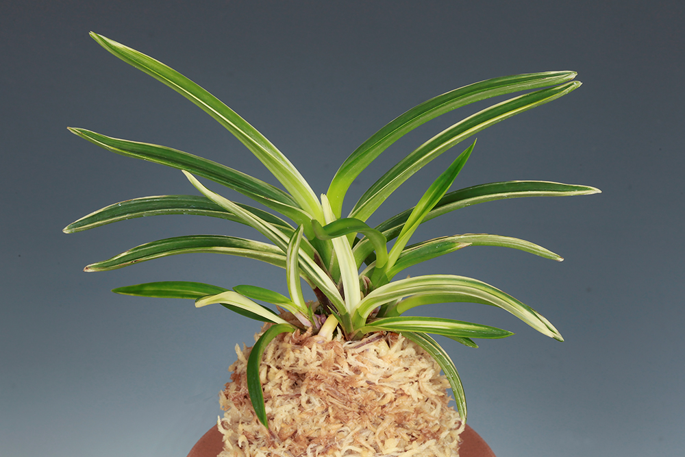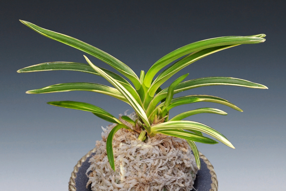 '화영(火影)'의 줄무늬(縞)에서 나온 설백복륜(雪白覆輪)이다. 이 품종은 임헌남 씨가 2022년에 '화영'에서 변화된, '화영의 縞' 개체를 재배 중에 복륜으로 진화한 것으로, 그동안 재배하면서 그 예(芸)의 고정을 확인하고 "일향관(一向冠)"으로 명명해, 증식에 힘쓰고 있다. 무늬는 선천성 설백복륜으로, '서출도' 타입의 하얀(白) 절입성(切込性) 삼광반(三光斑)에, 아래로는 구름의 호반(虎斑)도 동반하는 특수 예(芸)로, 맑고 단화(端華)하면서도 선연(嬋姸)한 분위기가 매력적이다. 호반인 '화영'이 縞와 더불어 복륜으로 변화는 경이롭고, 또한 매혹적인 총루비 뿌리까지 지녀, 찬란한 빛과 고운 운치가 잘 어우러짐이 미호(美好)하다. 바탕(紺地)과 무늬의 대비가 뛰어나다. 잎은 매끄럽고 고운 견지합(絹地合)에, 좌우로 평형한 희엽성으로, 노수엽도 섞이는 중형 종이다. 니축에 뿌리는 전체가 루비근으로, 붙음매는 월형이다.