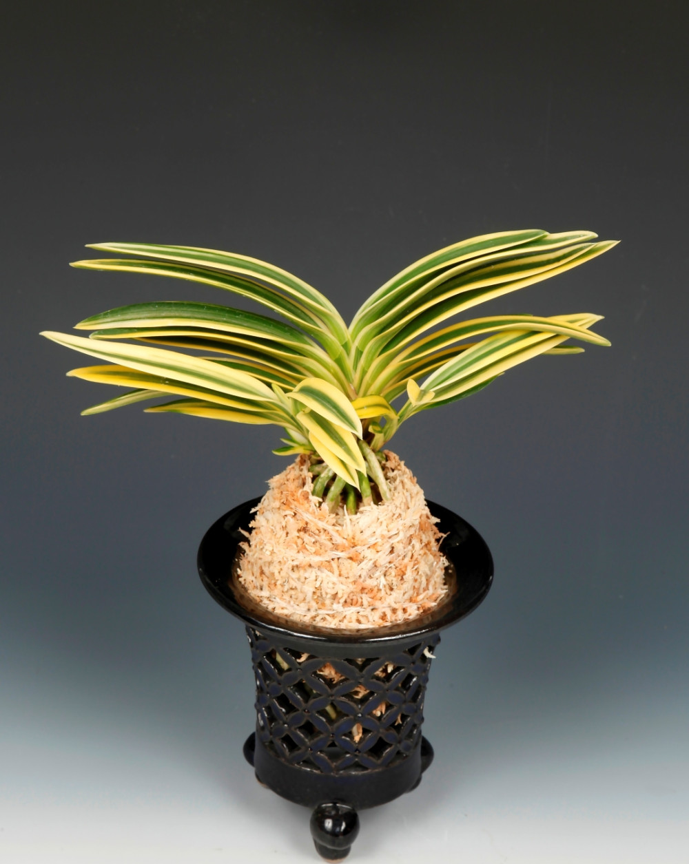 아마미계 풍란의 줄무늬(縞) 개체에서 변화한 유백색(乳白色)의 대복륜이다. 콘트라스트가 절묘한, 복륜의 예(芸)는 선천성의 백황색(白黃色) 삼광중반(三光中斑)으로, 선뜻 이 난의 오른쪽(上席)에 나설 것이 없는 양, 웅대하고 정갈한 복륜이다. 특히 신아의 어린잎은 고정성이 뛰어난 중투(中透)로 올라, 명료한 삼광중반으로 이행되어 잔존력의 스근한 매력이고, 뿌리 또한 루비를 섞는 일급품이다. 이 난은 조성호 씨 소장의 유일 품으로, '2024 나란히 동행전'에 출품, 대호평과 함께, 이름을 "나륜(娜淪)"으로, 아름다운 영상에서 명명이다. 잎은 넓고 두꺼운 대형에, 잎 간격(筬)이 조밀하고, 엽중(葉重)과 엽조(葉繰)가 좋아 축이 넓으며, 이슬 받이를 섞는 입엽성 희엽으로, 볼륨 만점의 다이내믹한 모습이다. 니축에 루비근과 니근이 섞이고, 붙음매는 얕은 월형이다.
