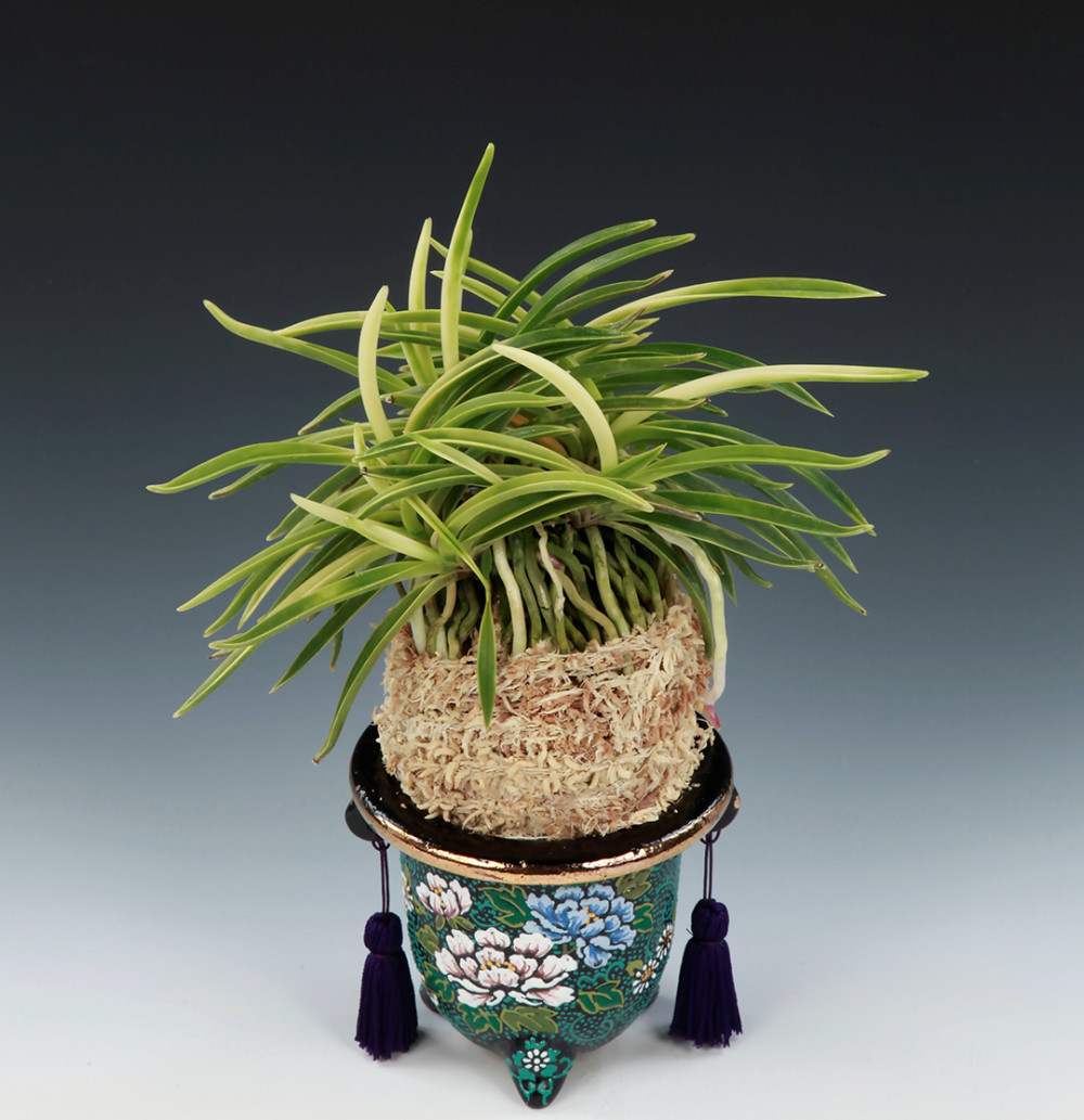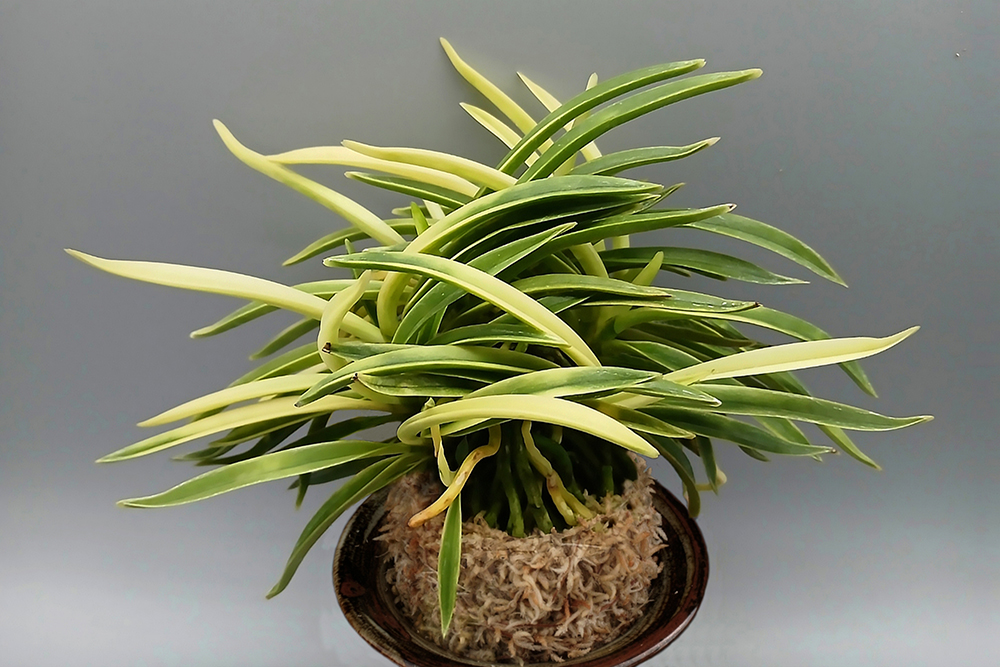 2011년 산내들 농원에서 아마미계 풍란의 실생으로 출현한 「모단 예(牡丹芸)」로, 호반(虎斑)의 사복륜(絲覆輪) 품종이다. 처음 김재훈 씨가 입수할 때는 거의 유령에 가까운 상태로 상당 기간 조마조마하게 유지해 오다가, 얼마 전부터 녹이 차오르면서 현재의 모습으로 완성되었다. 예(芸)의 천엽은 「모단 예(牡丹芸)」의 서반(曙斑)으로 오르면서 엽심(葉芯)을 따라 감중통(紺中通)을 흘리고, 두 잎 장째부터 어두워지면서 호반(虎斑)에 사복륜(絲覆輪)을 동반한다. 특히 감성(紺性)이 엷은 바탕에 간헐적으로, 오목하게 들어간 성반(星斑)과 줄무늬(縞)도 눈에 띄어, 또 다른 볼거리가 많은 품종이다. 중형에서 큰 편에 속하며, 잎끝이 예리하고, 아마미계 풍란 특유의 강력한 노수엽이 섞이는 완만한 희엽이다. 니축에 니근으로, 붙음매는 월형이다.1108ebf472291c34541f3c0fb3249897_1774731183_3995.jpg