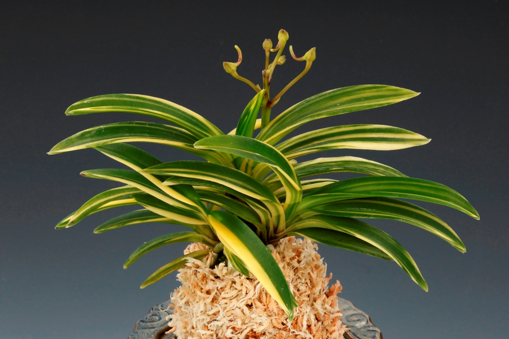 문향원에서 육종으로 나온, 아담한 중형으로, 유백색(乳白色)의 삼광중반(三光中斑)성 줄무늬(縞) 품종이다. 무늬의 예(芸)는 선천성으로, 크림색(cream 色)을 걸친, 삼광중반(三光中斑:잎 바깥쪽의 둘레와 그 안쪽의 무늬 형태가 서로 다르고, 잎 중심부가 감성(紺性)으로 되어 있는 복잡한 무늬 형태)을 수반한 유백색 호를 흘리는, 곱고 아름다운 절품(絶品)이다. '천군'이 지닌 예(芸)와 자태는 이 품종의 오른편(上席)에 선뜻 나설 것이 없는 빼어난 무늬는, 품격 높은 귀족 같으며, 특히 곧게 뻗어 올린 꽃대에 매판화(梅弁花)로 하늘피기까지 더하니 기세가 당당하다. 중형 종으로, 잎은 터질 듯한 넓은 광엽에, 곡선미가 아름다운 희엽으로, 콤팩트한 모습이 자랑스럽다. 니축에 니근으로, 붙음매는 일자형이다.