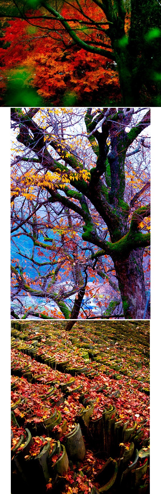 나란히 쌓여있는 기왓장들 위로 내려 앉은 단풍잎이 인상적입니다