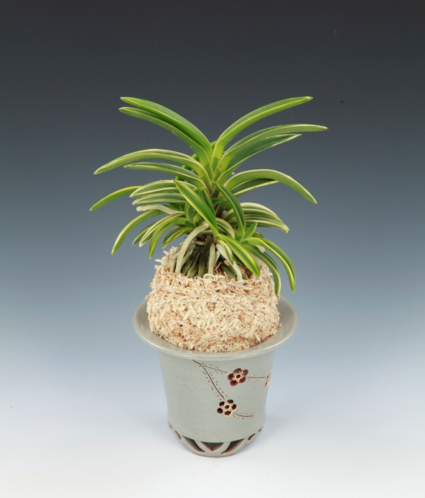 품종의 특징 : 새잎은 짙은 감지에 올리브그린을 후발성(後發性)으로 두른 후, 서서히 백황의 삼광반으로 발현되는 품종이다. 평범한 복륜이 아닌, 삼광의 예를 지녔으며, 그 색상마저 고상하며, 신아의 새잎은 중투로 나온 후, 시간이 흐름에 따라 삼광반 복륜으로 고정됩이다. 니축에 니근으로, 붙음매는 일자에 가까운 얕은 월형이다.