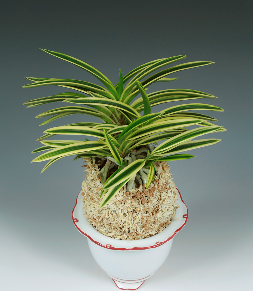 품종의 특징 : 아마미계로 백복륜(白覆輪)품종으로 천엽은 올리브그린으로 올라와 서서히 백색의 복륜으로 완성되는 후천성 백복륜 품종이며 수많은 아마미계 복륜중에서 비교적 식별이 쉬운 품종이다. 입엽성 희엽으로 크기는 중형종이며 니축에 니근으로 붙음매는 얕은 월형이다.